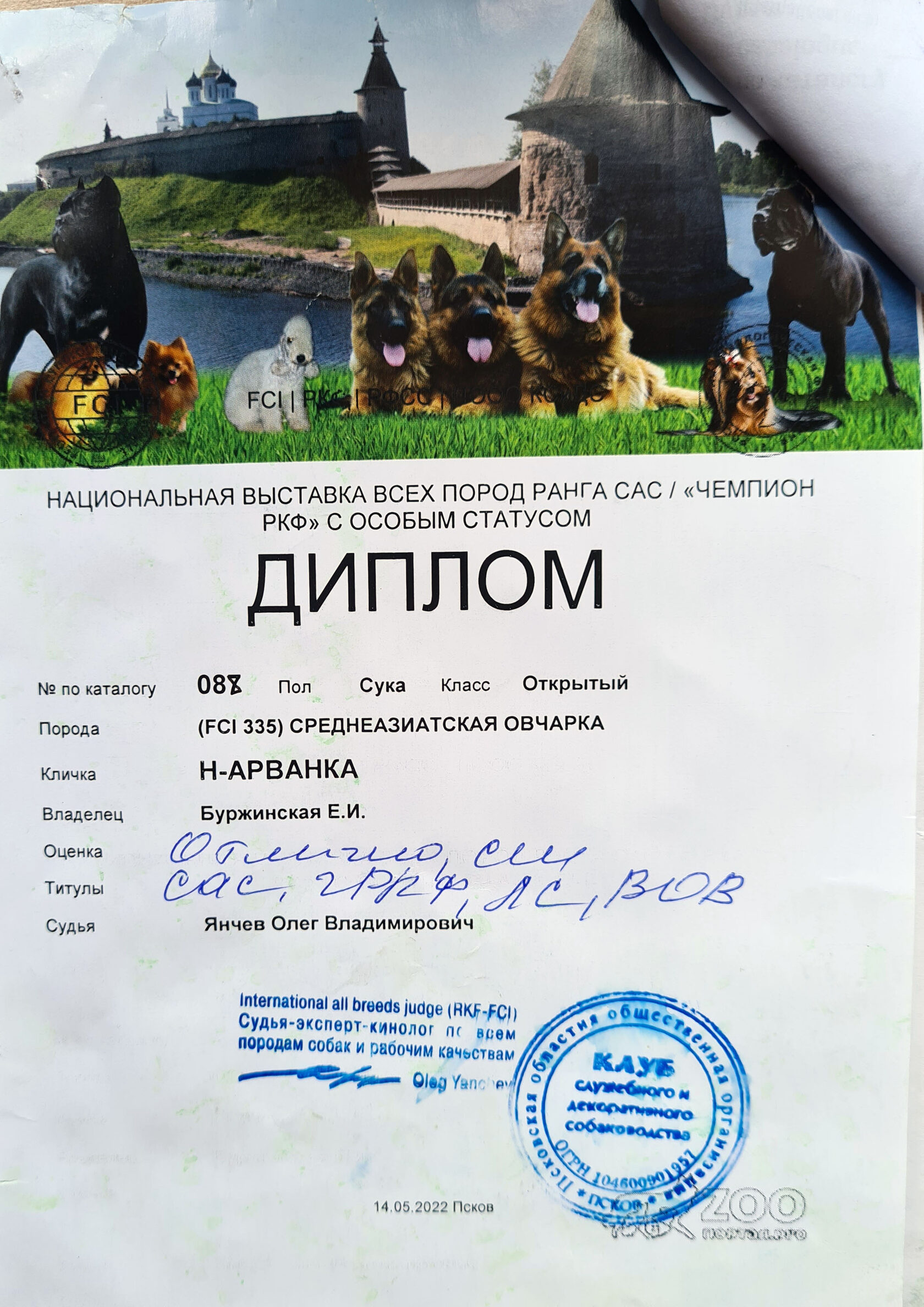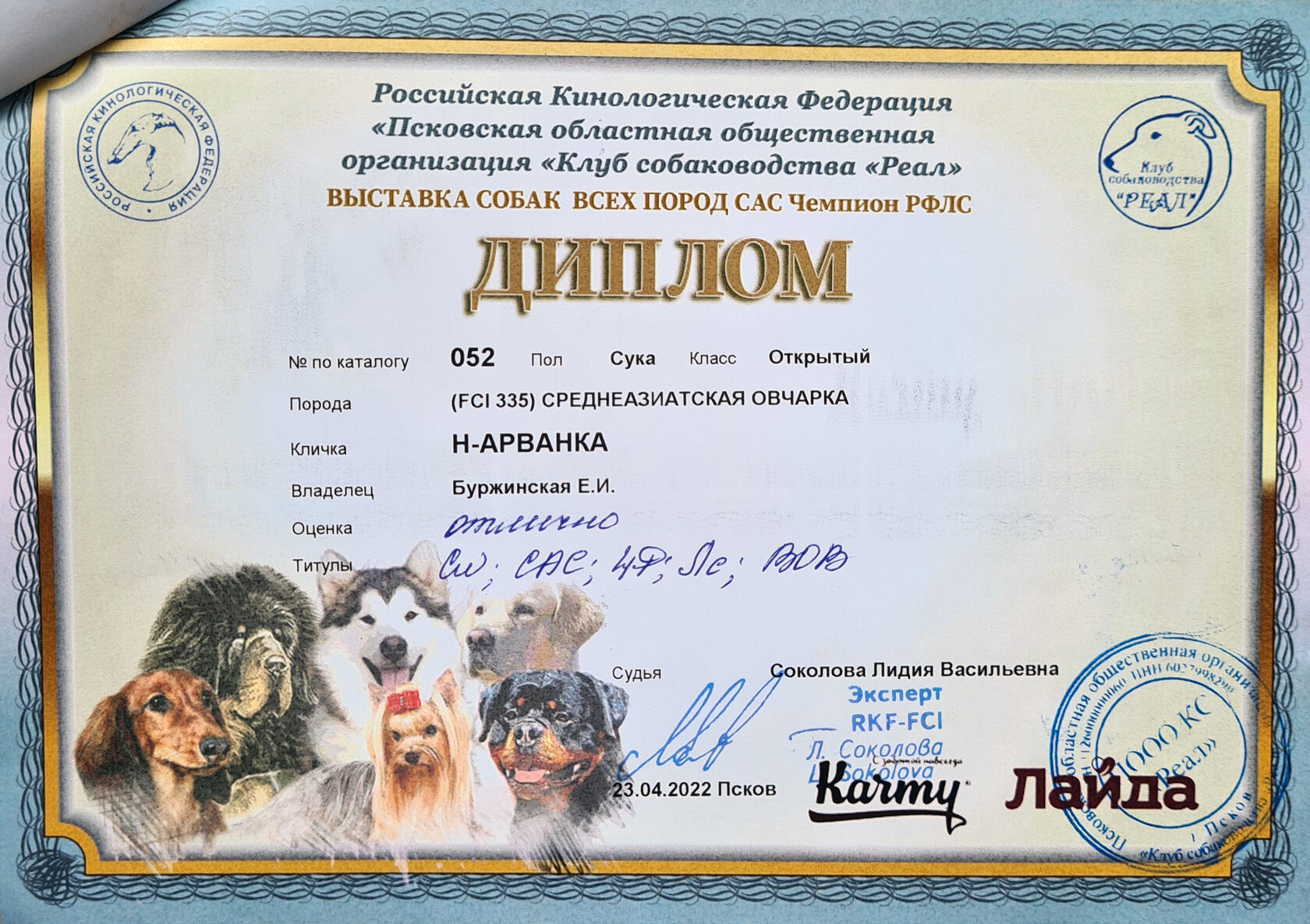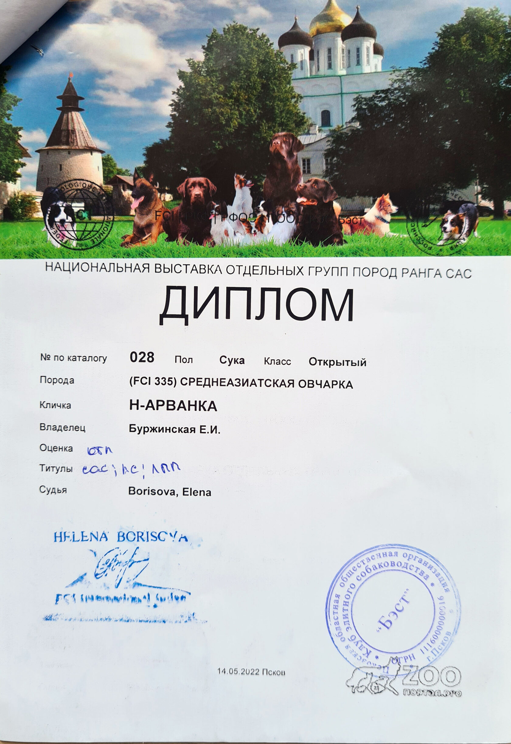 24.06.2022 года у Н-Арванки появилось 3 малыша-крепыша. Черноголовые, белые с чёрным (в будущем крапчатые, как свои родители) парни. Родились с максимально возможным для детёнышей алабая весом.