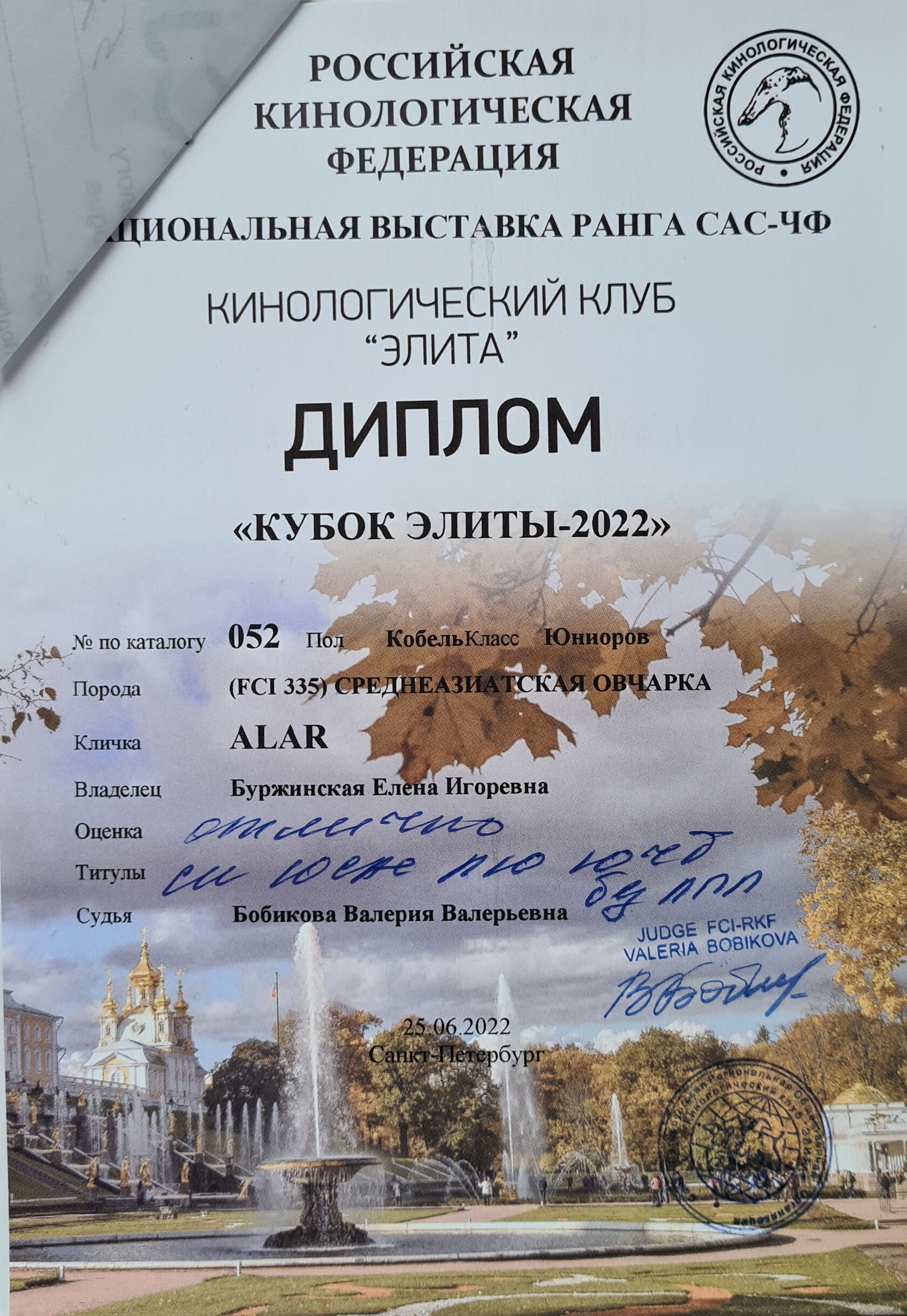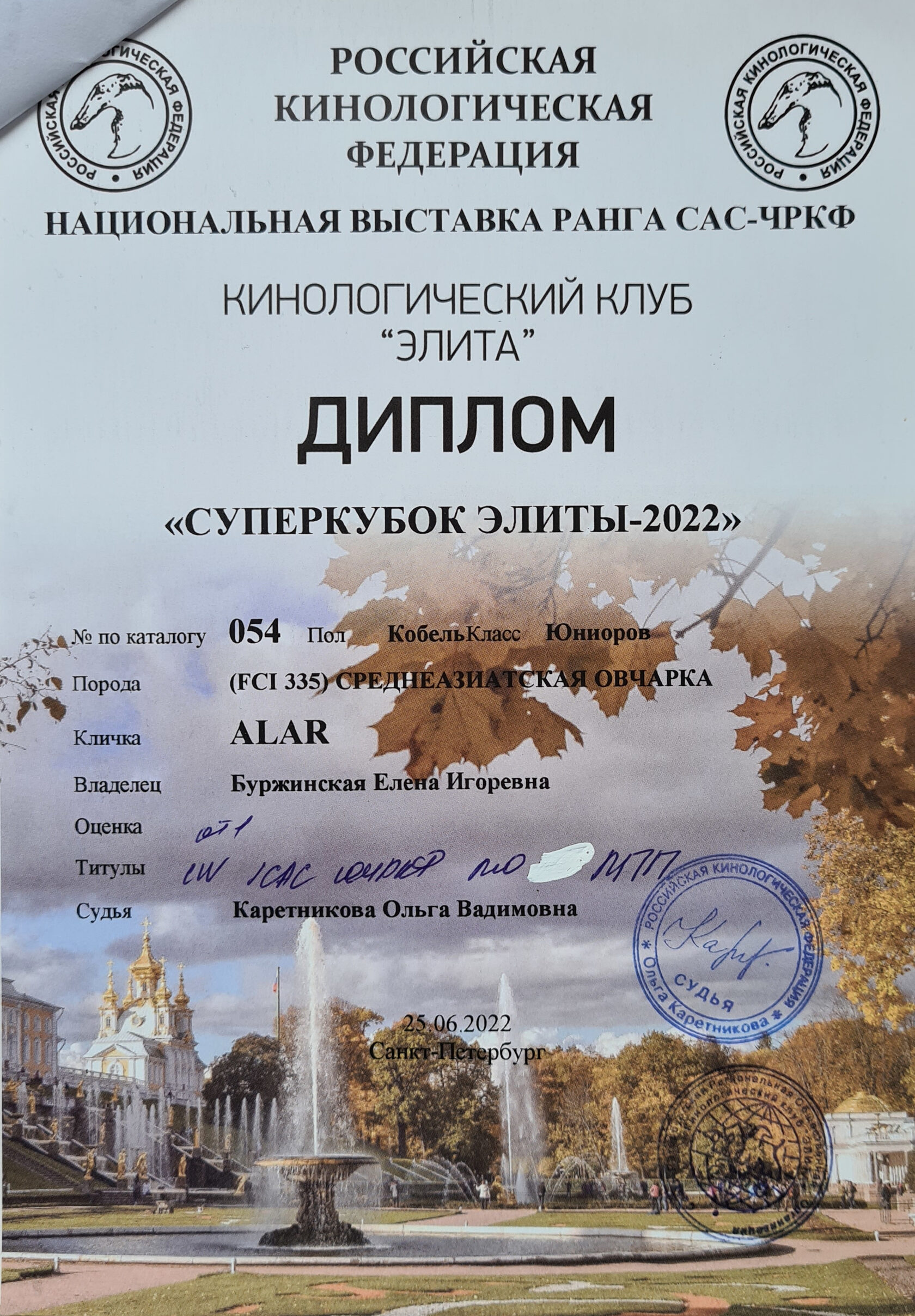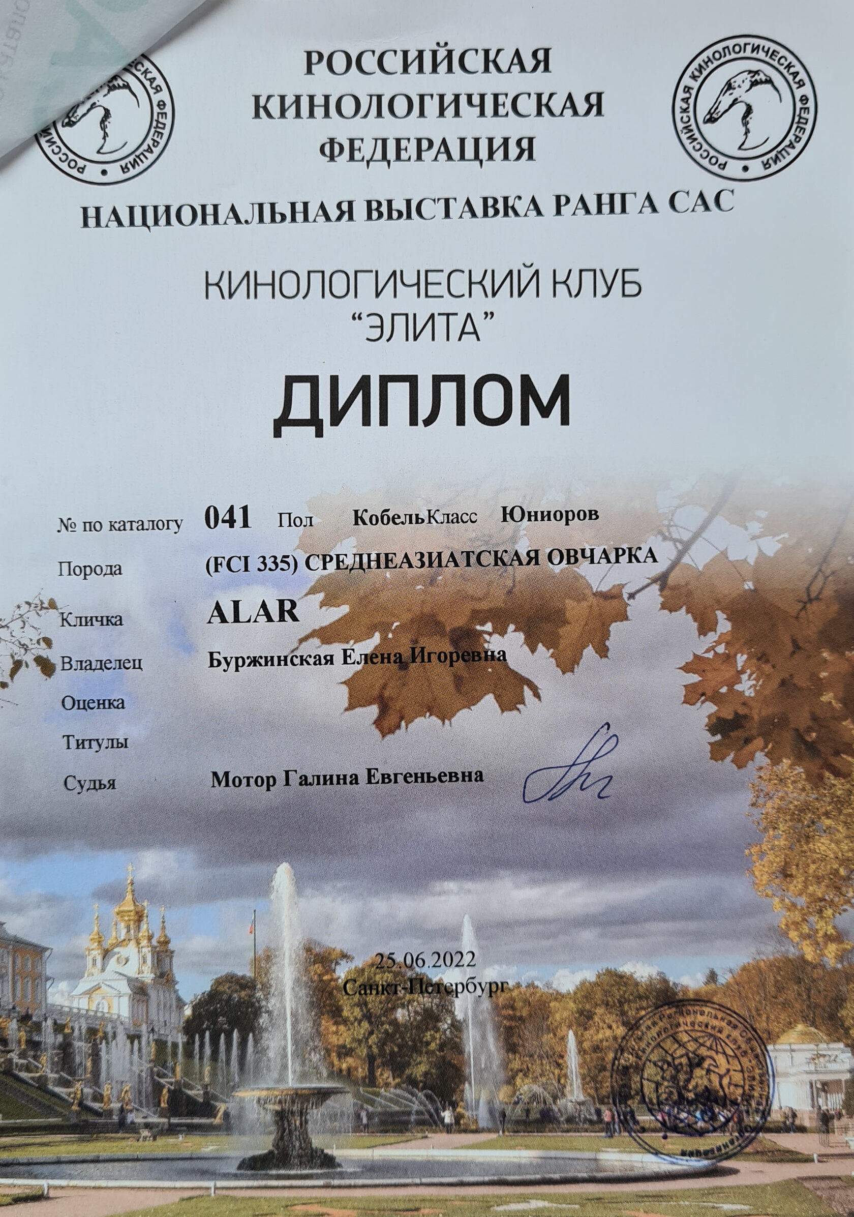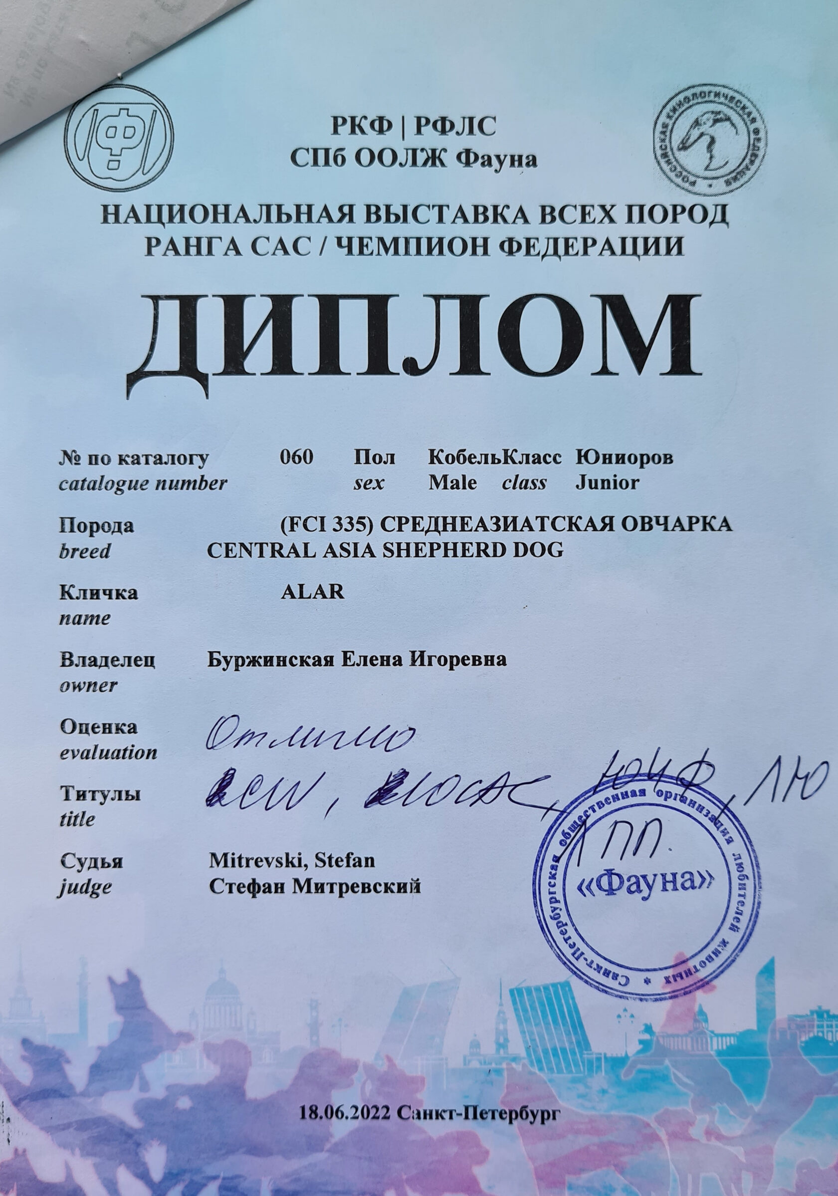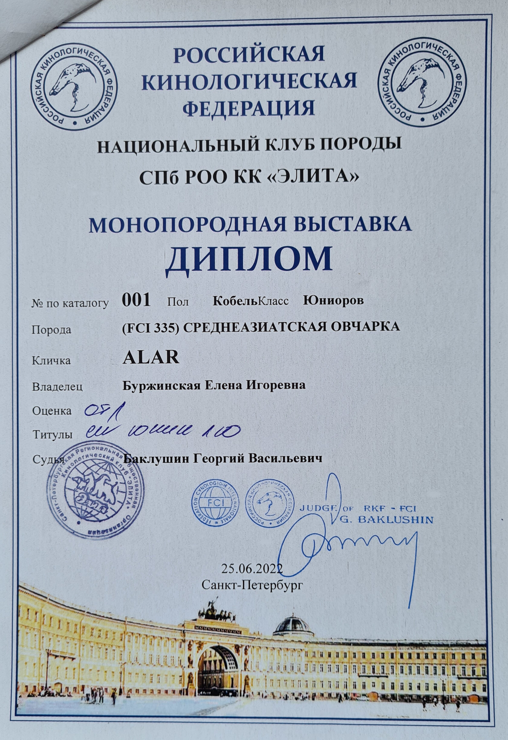 Алабай в свои 1.5 года обладает титулом юного чемпиона России и в настоящее время готовится продолжить карьеру в промежуточном классе.
